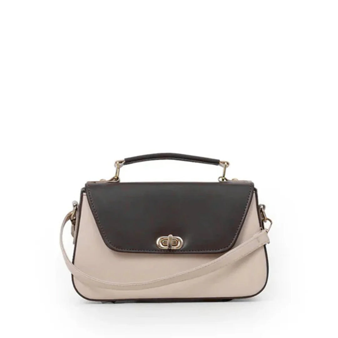 This two-tone handbag blends black with soft beige and gold accents for a look of understated luxury. Its structured silhouette and flawless finish bring elegance to every detail. Whether carried by the handle or worn crossbody, it defines modern grace with effortless charm.