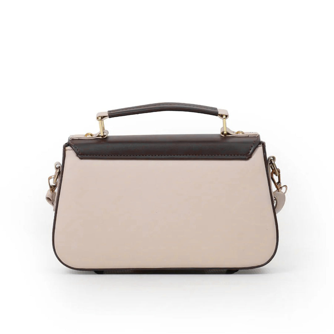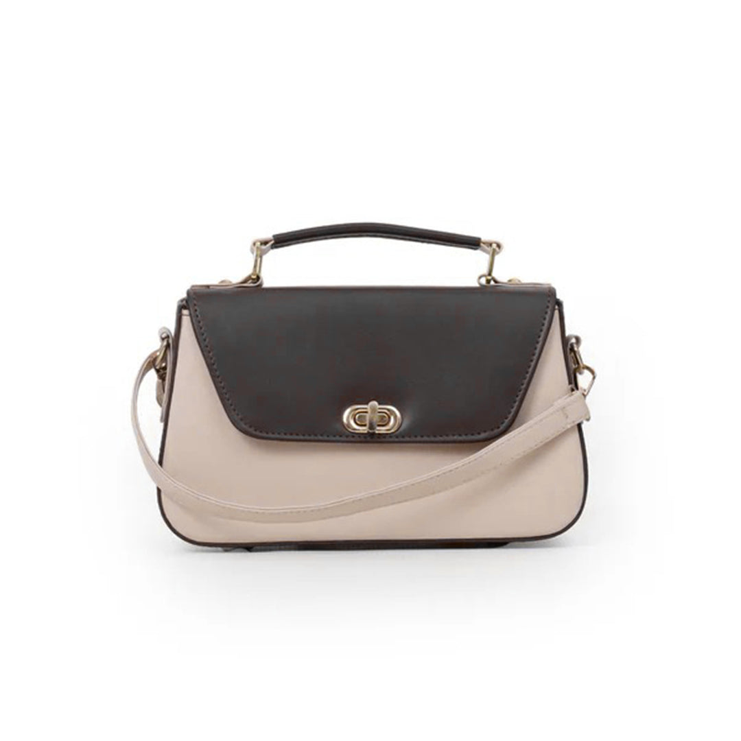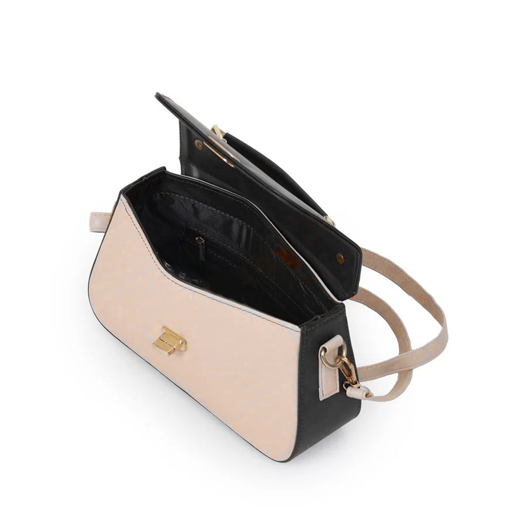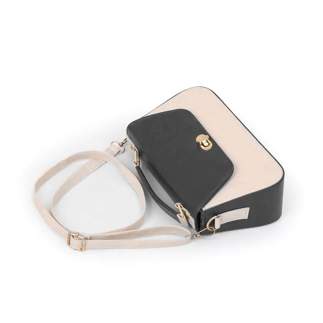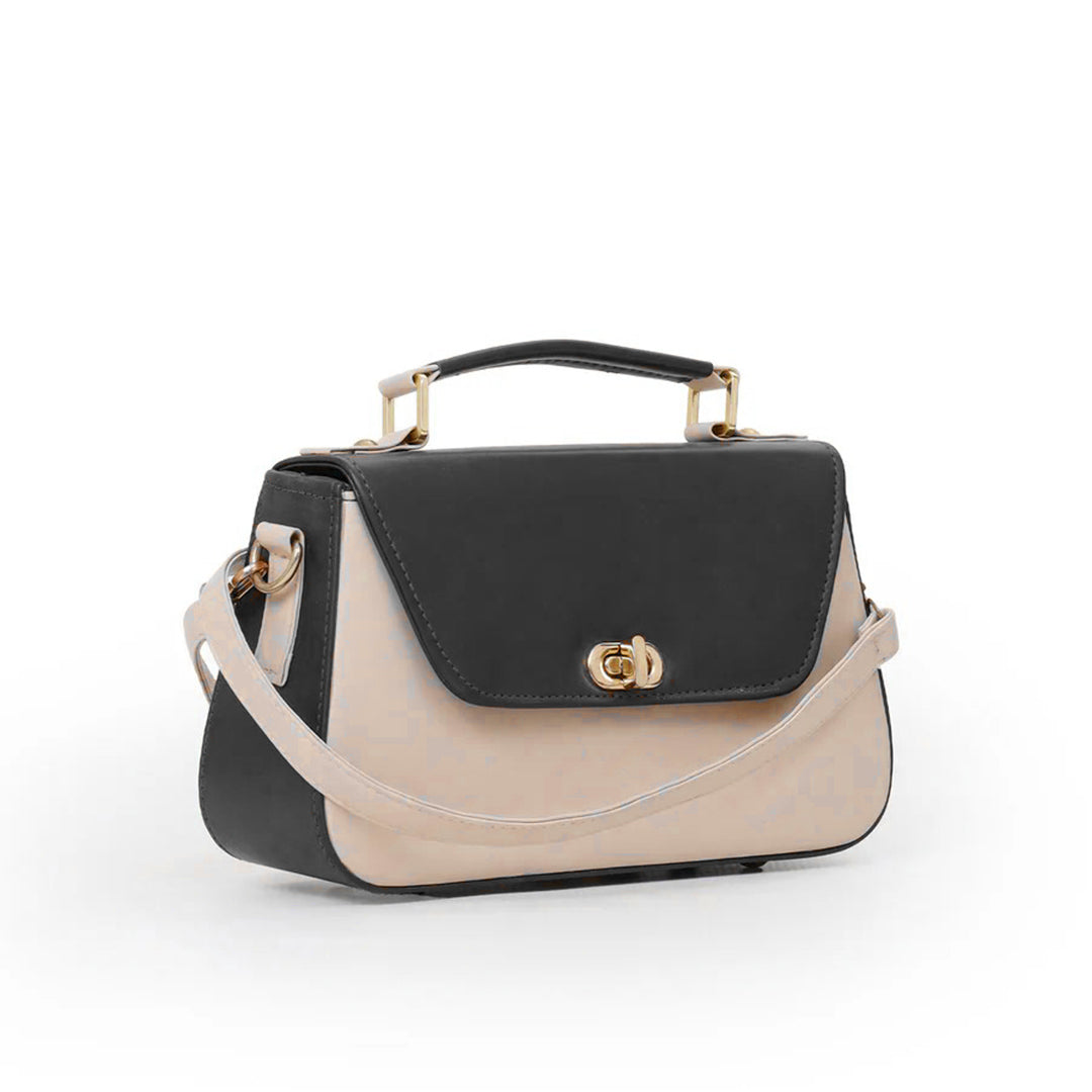 This two-tone handbag blends black with soft beige and gold accents for a look of understated luxury. Its structured silhouette and flawless finish bring elegance to every detail. Whether carried by the handle or worn crossbody, it defines modern grace with effortless charm.