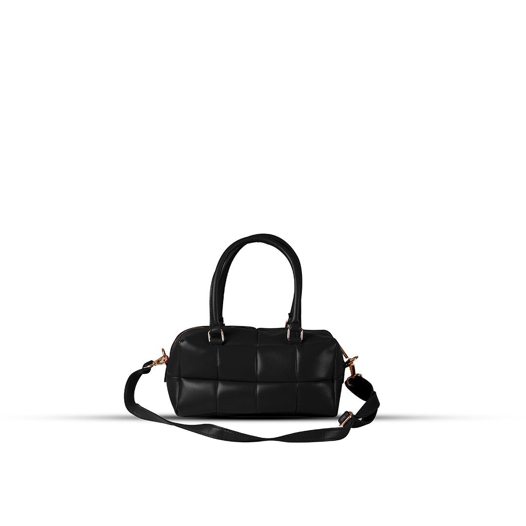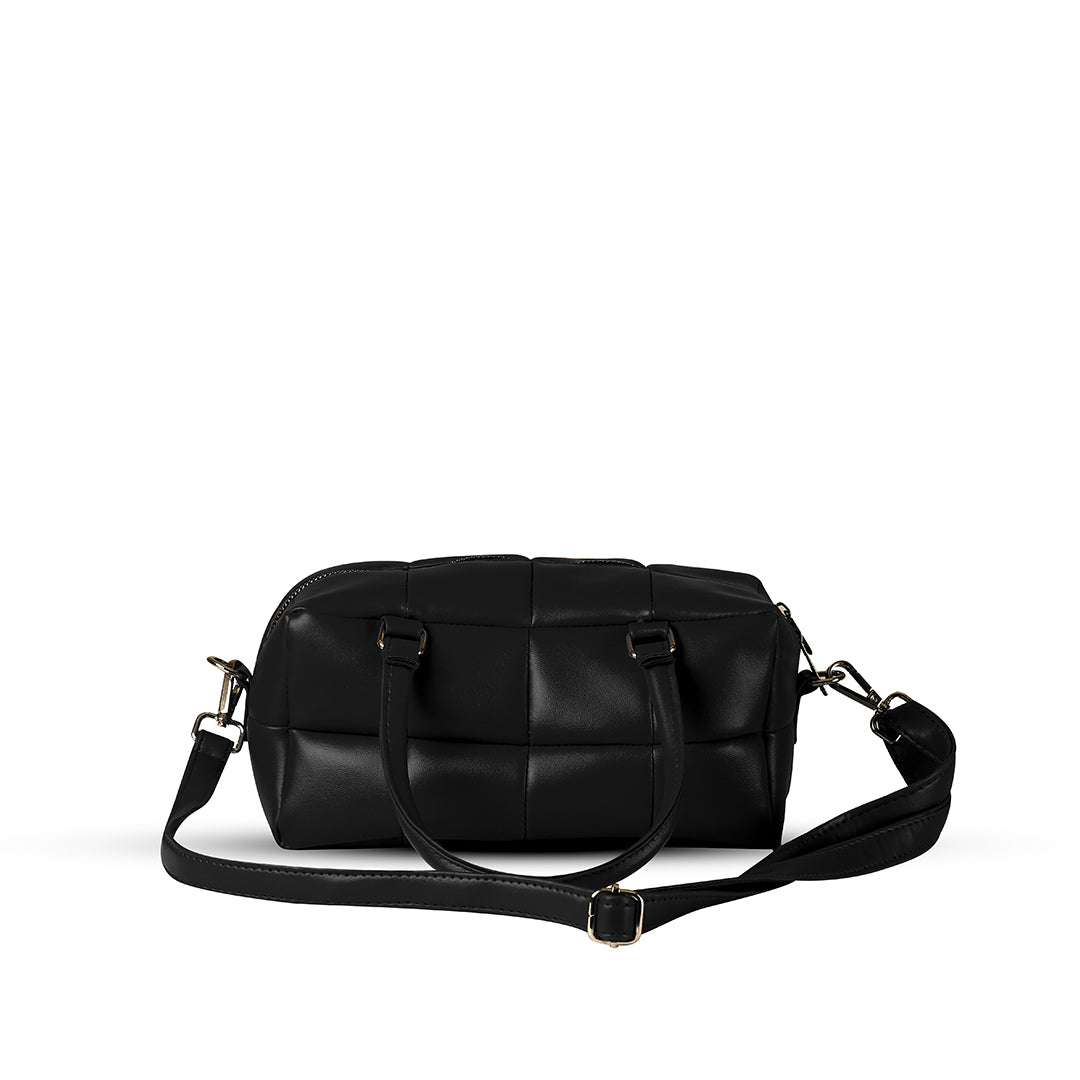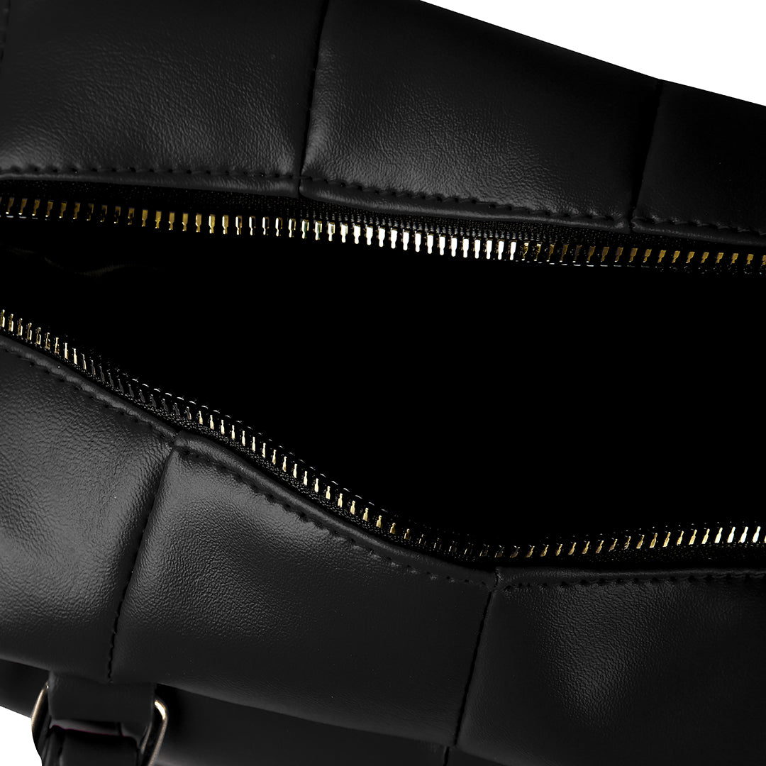 Meet your new go-to bag. This black quilted satchel features a unique padded texture and gleaming gold-tone hardware that adds a touch of luxury to any outfit.
