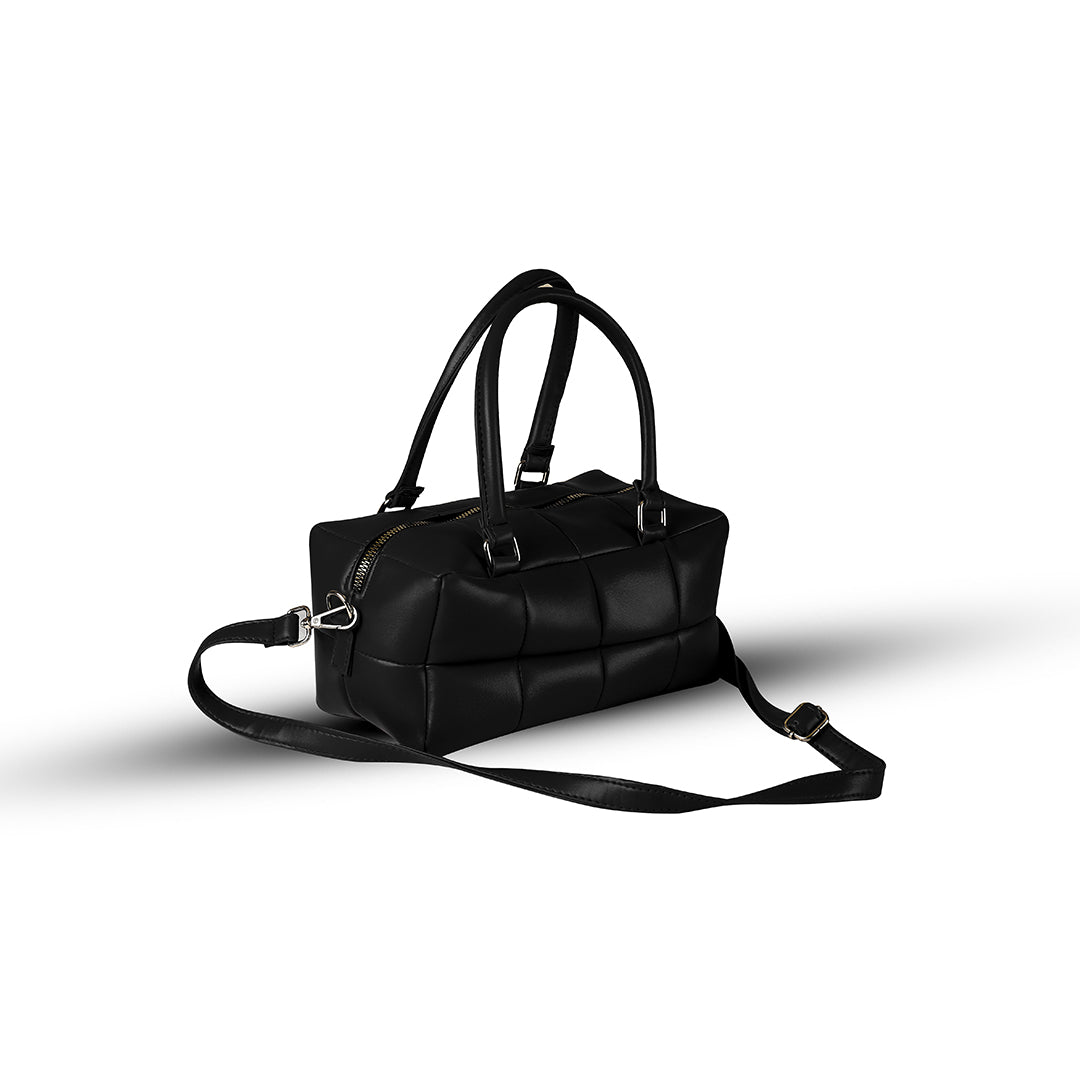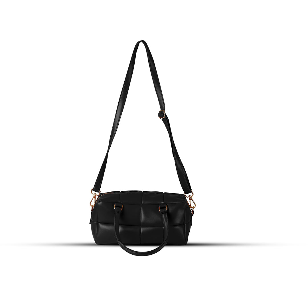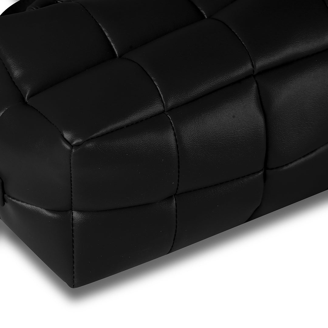 Meet your new go-to bag. This black quilted satchel features a unique padded texture and gleaming gold-tone hardware that adds a touch of luxury to any outfit.